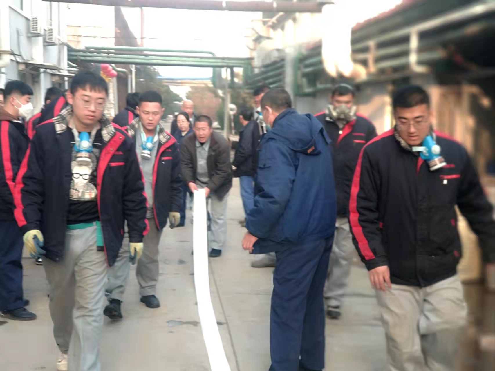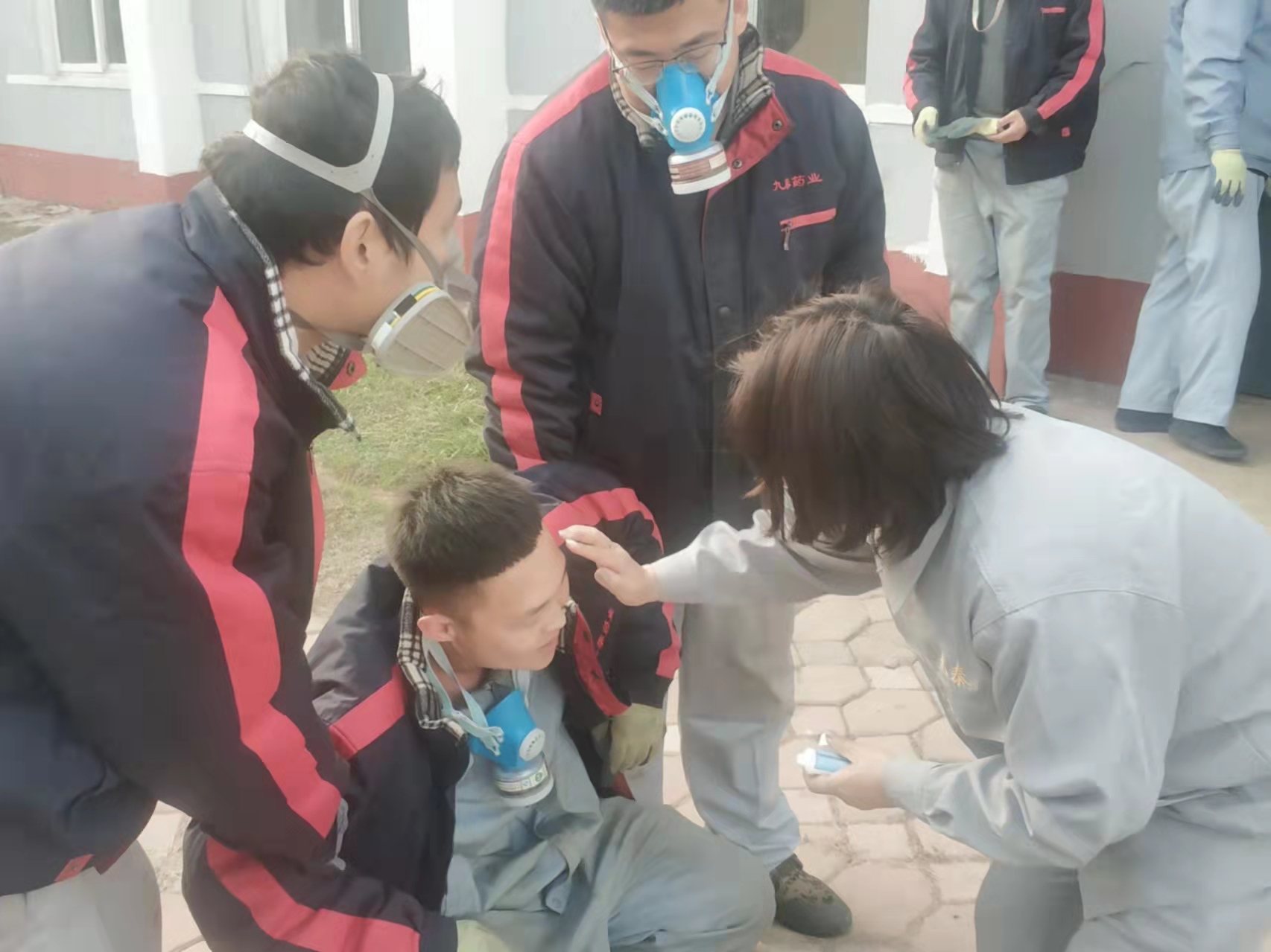 演練模擬原料車間合成一室發(fā)生火災(zāi)爆炸,車間立即啟動應(yīng)急預(yù)案,進(jìn)行實際演練。
